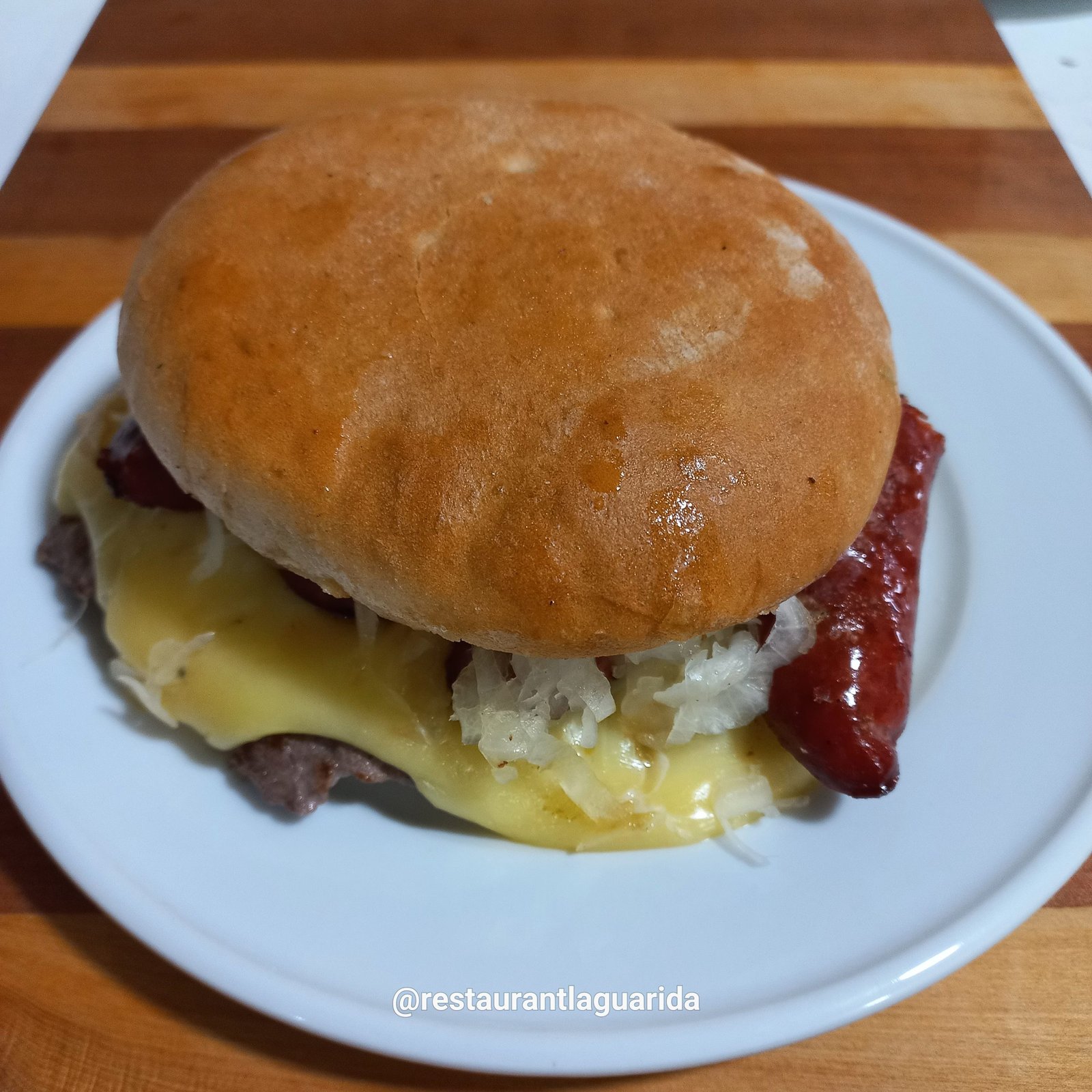 Pan de churrasco, carne de vacuno (100% lomo de vacuno), longaniza, chucrut caliente y queso fundido.