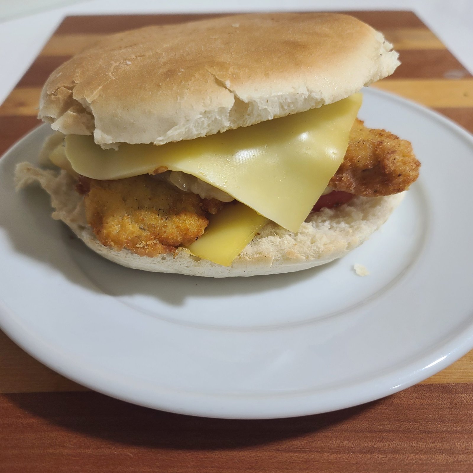 Sándwich de pollo frito, cebolla caramelizada, tomate con un toque de orégano y queso fundido.