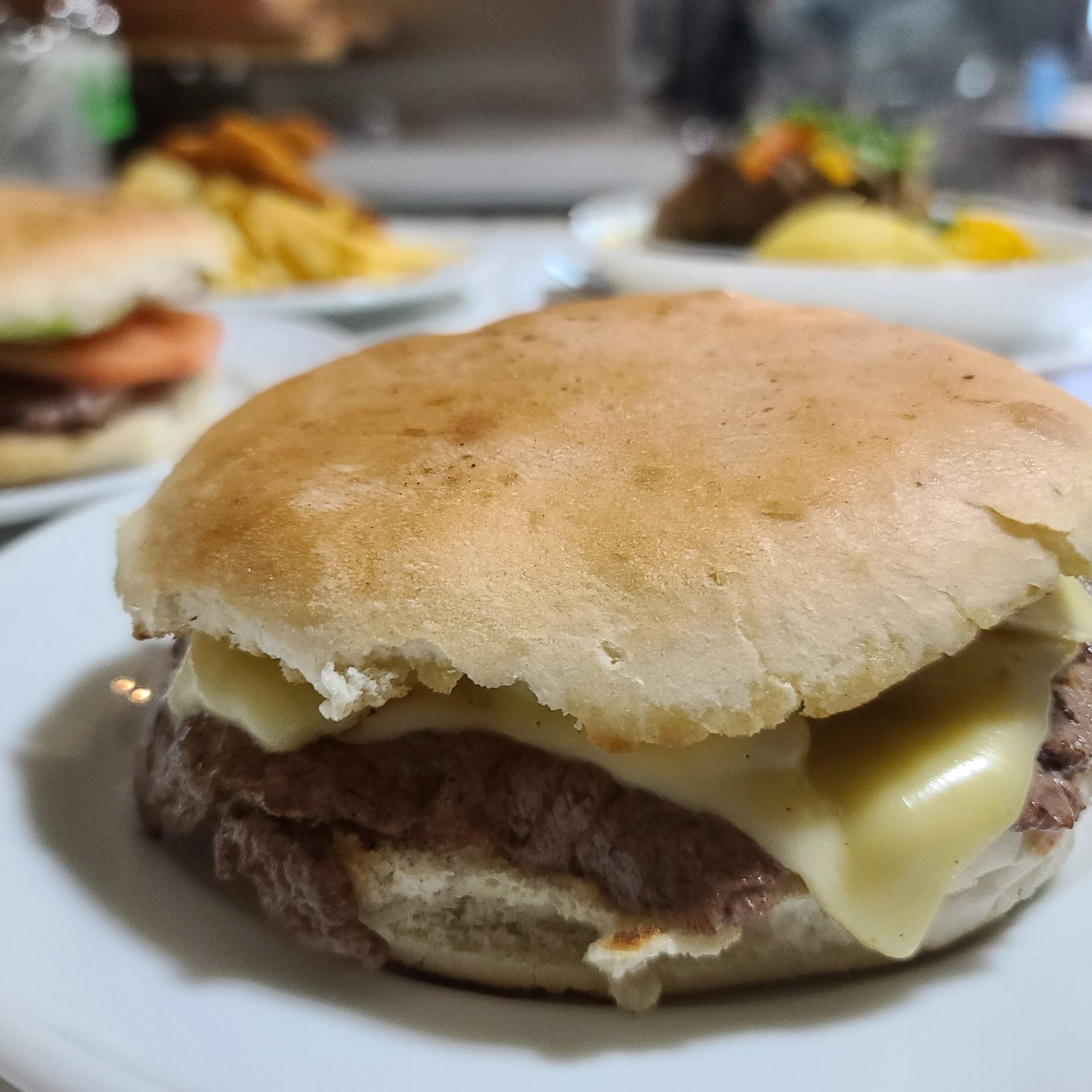 Sándwich tradicional chileno; pan frica, carne de vacuno (100% lomo de vacuno) y generoso queso fundido.
