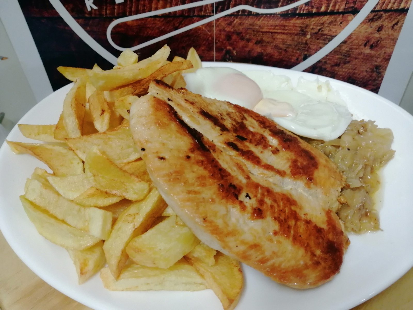 Pechuga deshuesada a la plancha con un toque de mantequilla papas fritas caseras, cebollla caramelizada y dos huevos fritos.