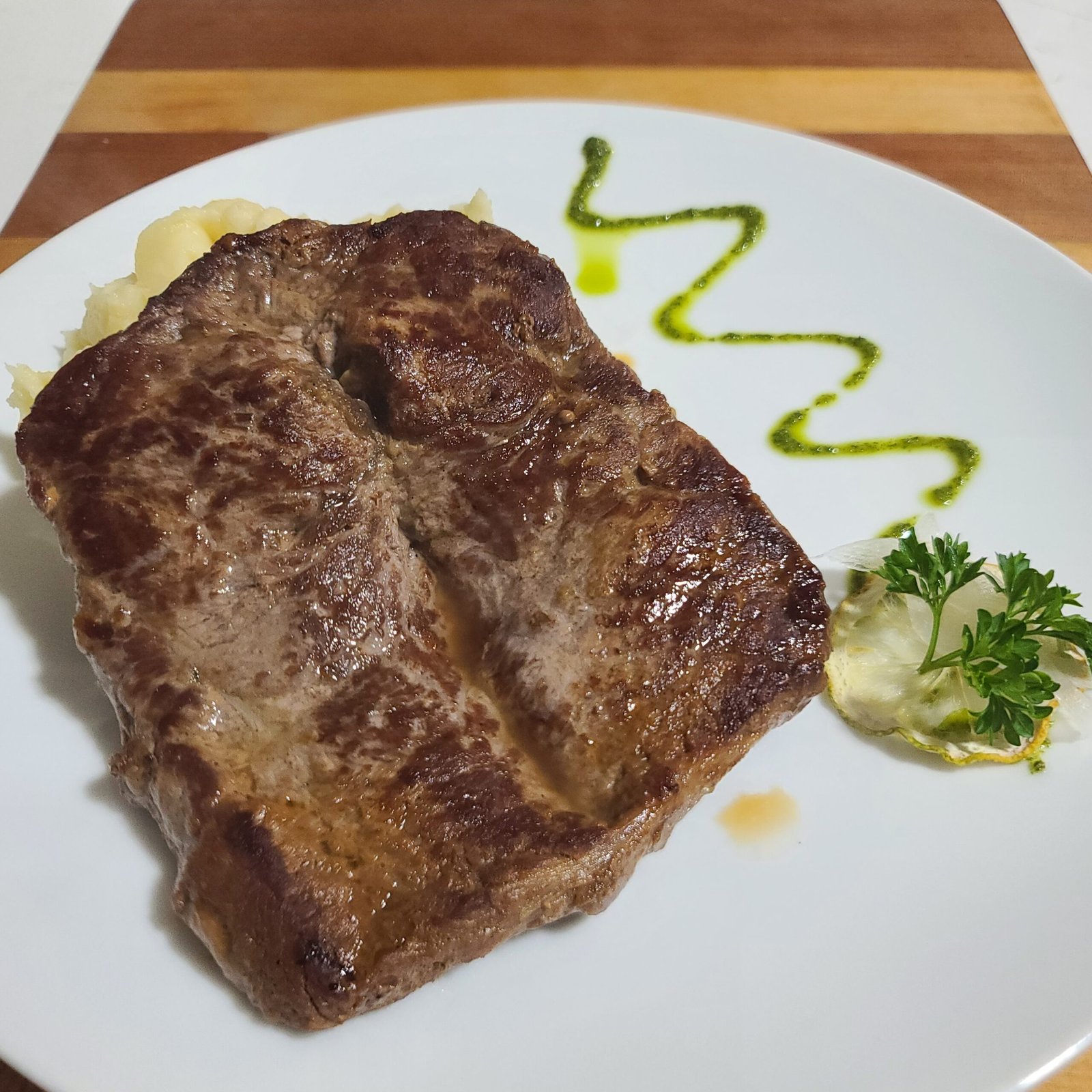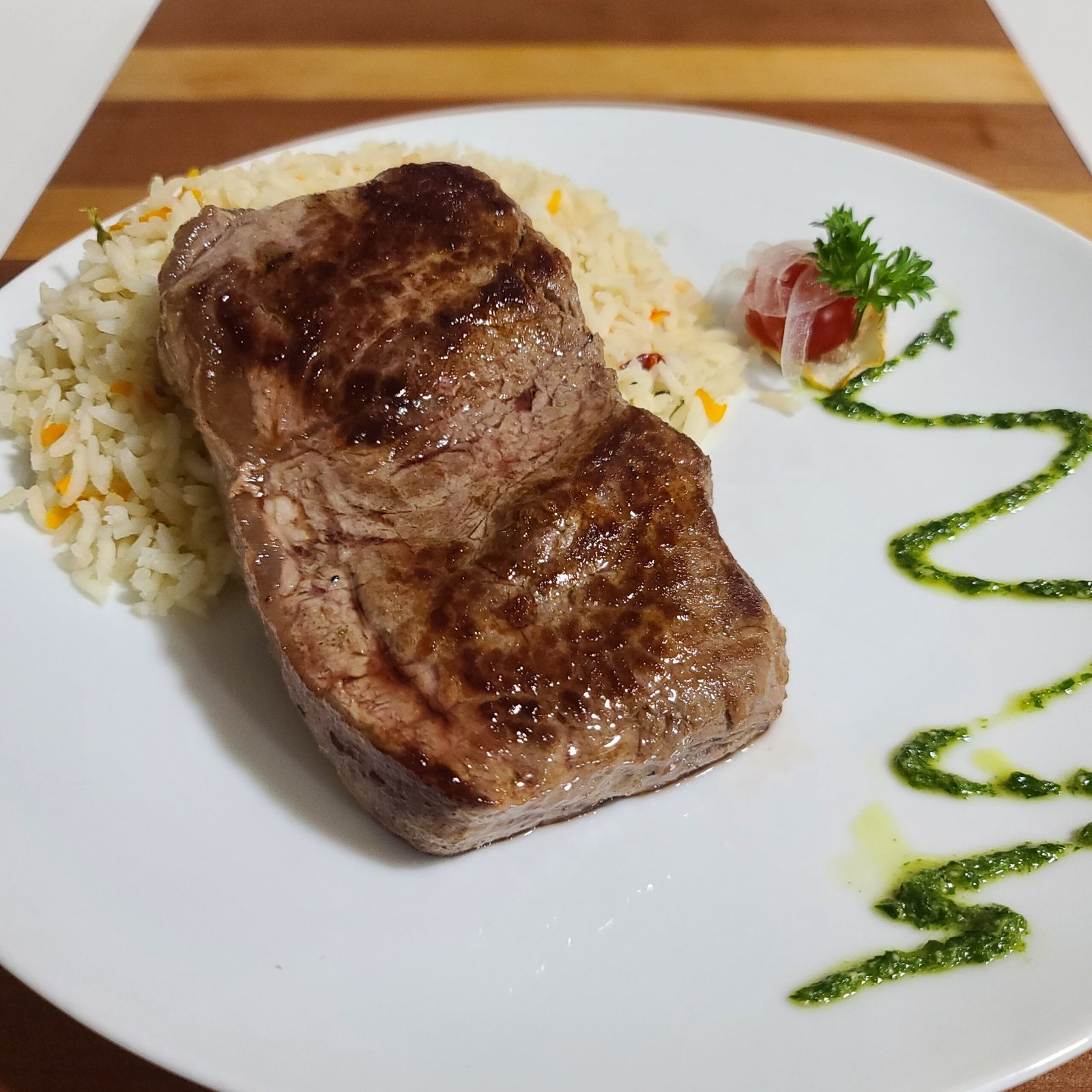 Porción de lomo de vacuno (liso) de unos 360 grs, cocido a la plancha en el punto de cocción que más disfrute, y su acompañamiento .
